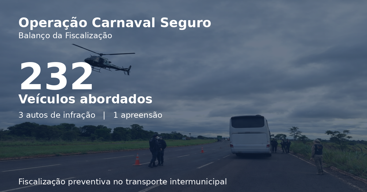 A Agência Estadual de Regulação (AGEMS) concluiu a Operação Carnaval Seguro com a abordagem de 232 veículos do transporte intermunicipal de passageiros em Mato Grosso do Sul. A ação, iniciada no dia 13 de fevereiro, teve como foco a fiscalização preventiva, com base em inteligência de dados e atuação em pontos estratégicos de maior demanda.